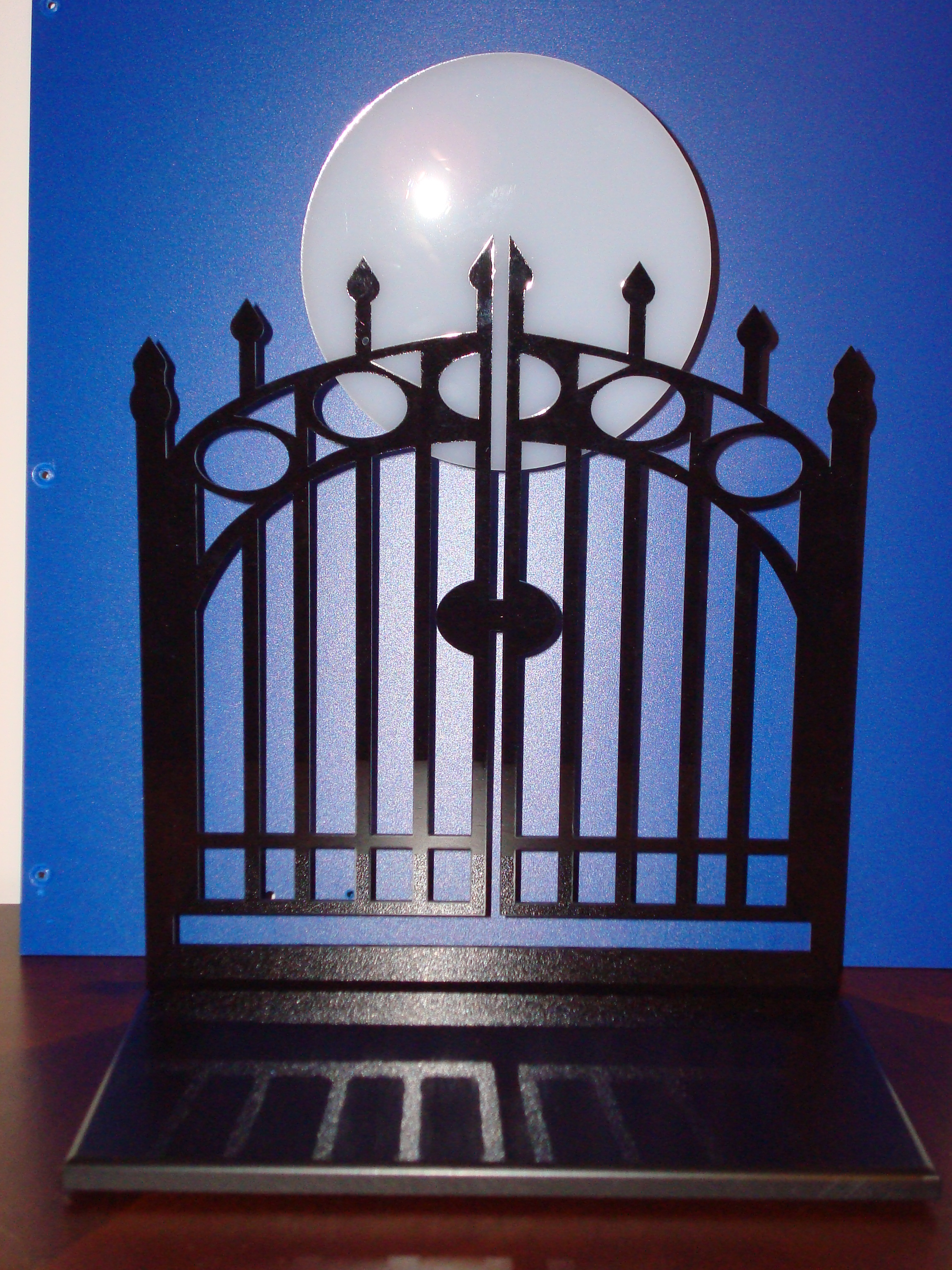 This is one of the meal event centerpieces for the 2013 NBDCC. The displays provided are black matte HDPE base, black acrylic laser-cut garden gate with a milky white acrylic moon that glows when lit from behind, creating a magical effect around the room.