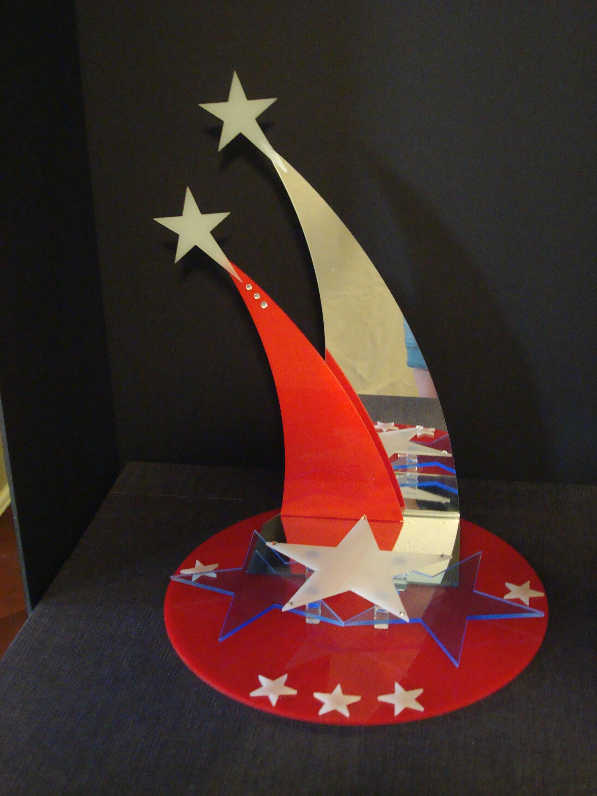 This is Ninimomo’s Raffle Room donation for the 2014 NBDCC. The display created represents shooting stars and is made from acrylics in bright red, milky white, fluorescent blue and mirrored, along with a few crystal accents.