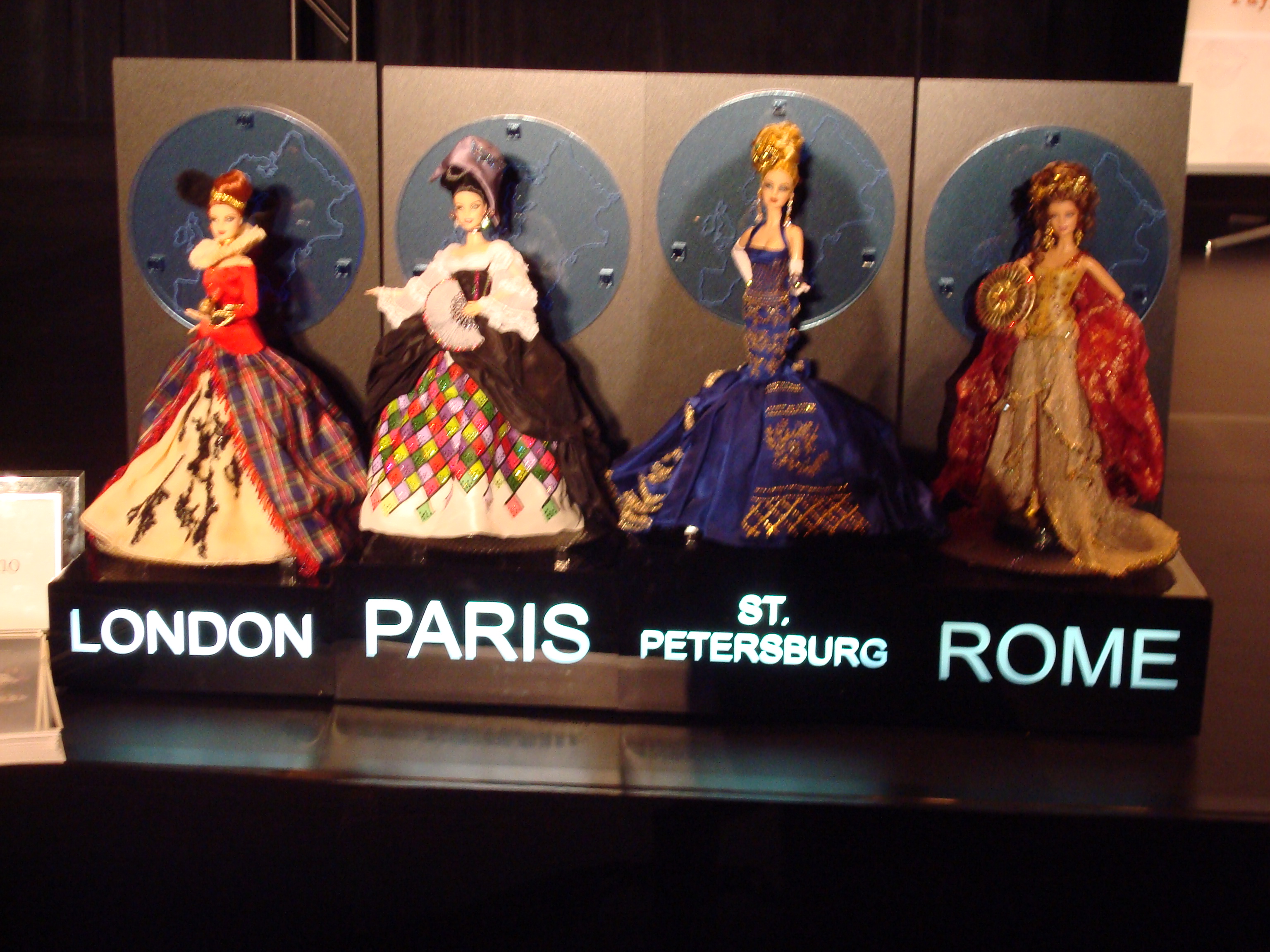 This is Ninimomo’s Live Auction donation for the 2012 NBDCC. The display created stays with the convention theme of The Grand Tour, representing London, Paris, St. Petersburg and Rome. The displays (4 separate) are made of black, clear honeycomb and fluourescent blue acrylics. Each city is lighted from within and the round blue fluourescent back acrylic has the European continent etched in it with a crystal designating each specific city location.