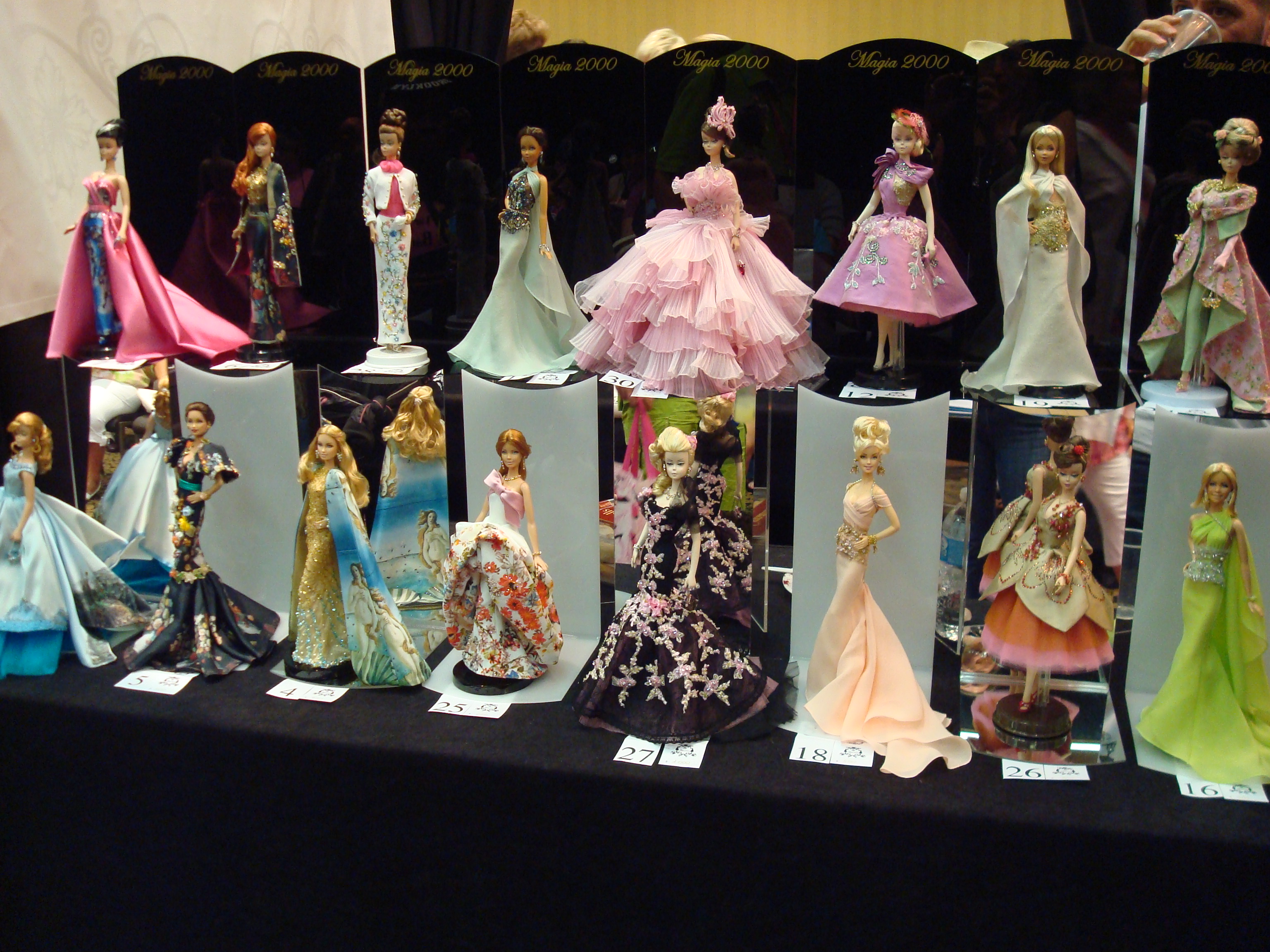 We worked with OOAK doll artists Magia2000 to showcase their dolls for their convention sales events. They wanted an understated elegance to compliment the elegance of their dolls. These displays are actually two pieces, each having a black acrylic back piece (lettered in gold with Magia2000) and either a mirrored or milky white insert piece. For this convention, Magia separated the inserts from the backs, doubling the number of displays available.