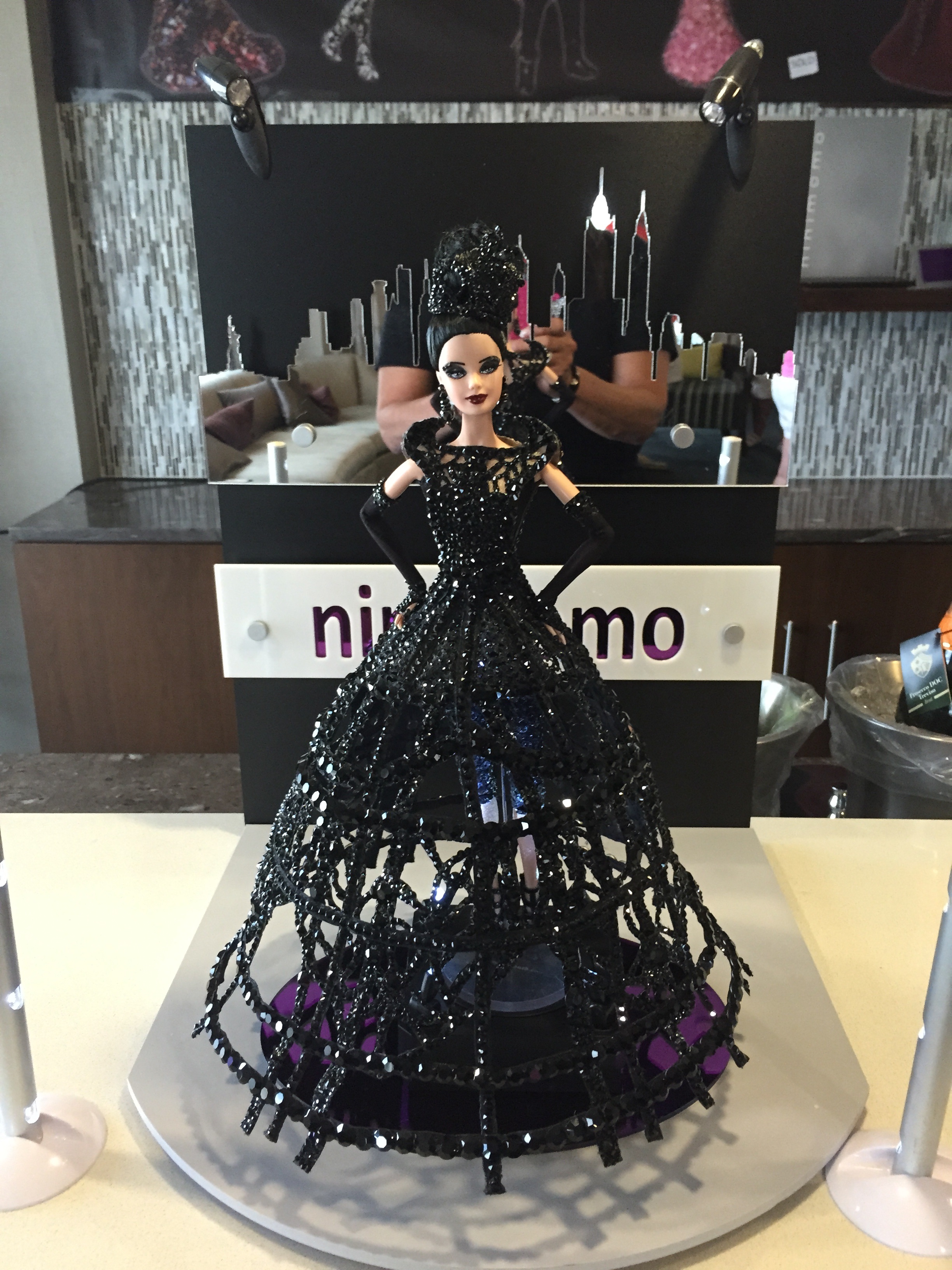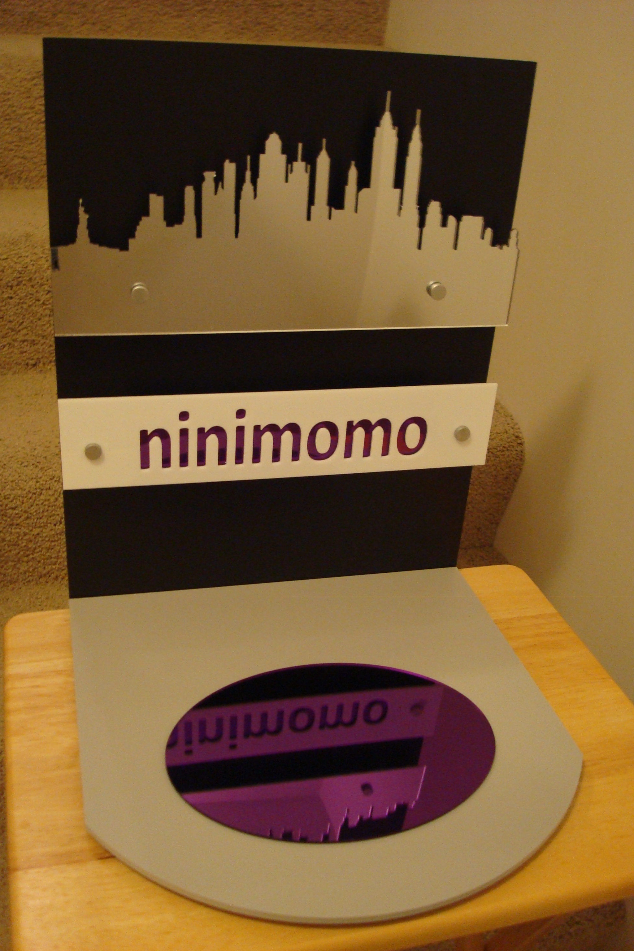 This is Ninimomo’s Live Auction donation for the 2015 NBDCC. The display created represents New York and Broadway. The base is gray pvc with an oval purple mirrored acrylic pedestal. The black pvc back has the New York skyline in clear mirrored acrylic and Ninimomo cut out of white acrylic and backed in purple mirrored acrylic ~ both pieces mounted on raised silver posts.