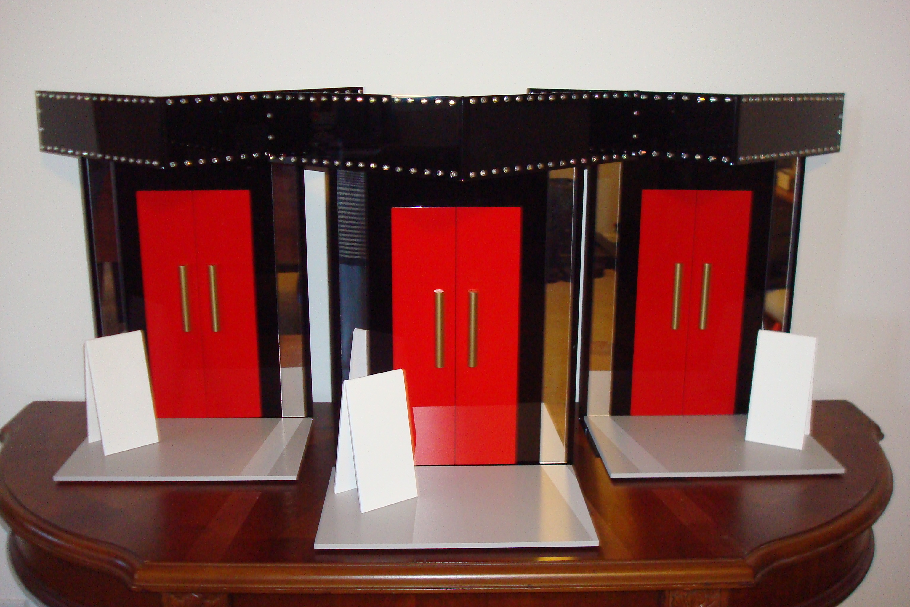 They are a black, clear mirror and red acrylic back pieces, gold painted clear acrylic door handles, with a separate black acrylic marquee studded in crystals. The gray pvc base mimicks the sidewalk with white acrylic front show signs.